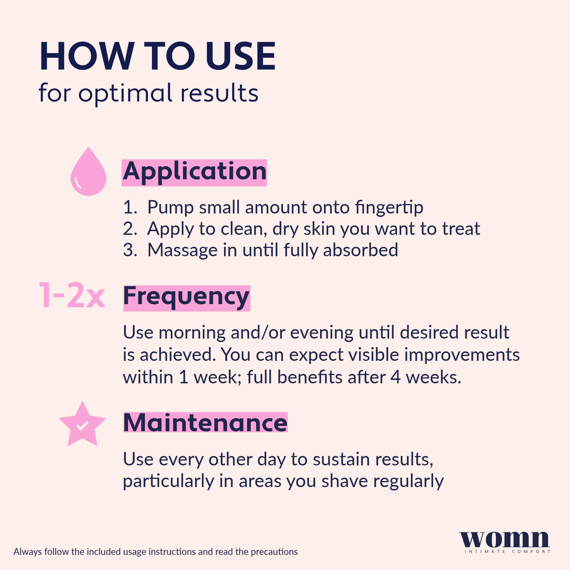 Trage das Serum auf die saubere und trockene Haut auf und massiere es ein, bis es vollständig eingezogen ist. Verwende es morgens und/oder abends bis das gewünschte Ergebnis erreicht ist. Du solltest bereits nach 1 Woche sichtbare Verbesserungen feststellen können, wobei die vollen Vorteile in der Regel nach 4-wöchiger Anwendung erzielt werden. Zur Aufrechterhaltung der Ergebnisse, insbesondere in den Bereichen, die du regelmäßig rasierst, empfehlen wir, das Serum jeden zweiten Tag zu verwenden, um neue eingewachsene Haare zu vermeiden.